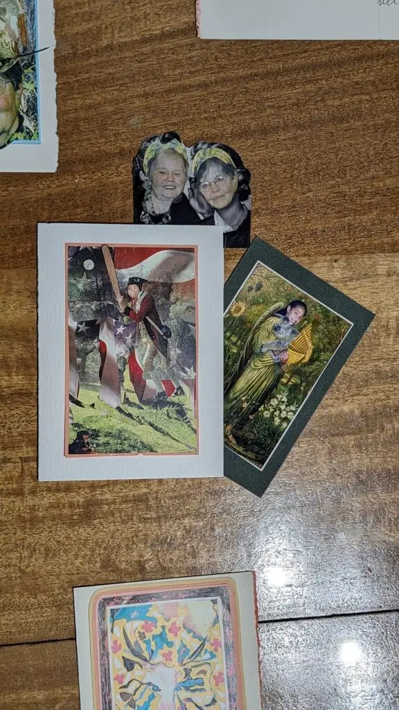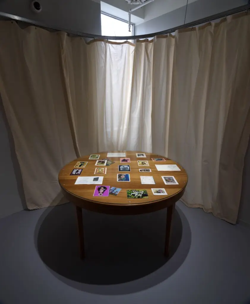 “Dining Table” is another profound work that brings Shaddle’s home life into her art and captures the significance of domestic spaces. Featuring Shaddle’s circular wooden table from the Frank Lloyd Wright-designed George Blossom House, the installation blurs the boundaries between art and everyday life. The table, adorned with collages and postcards, transforms a familiar domestic object into a canvas for artistic expression. This piece evokes a deep sense of nostalgia, reminiscent of childhood memories and familial gatherings around the dining table.